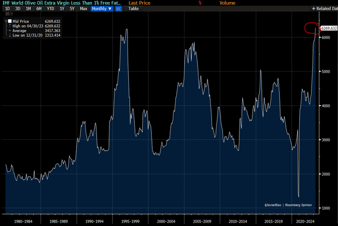 CHART OF THE DAY: Benchmark extra virgin olive oil prices have surged to an all-time, surpassing the previous record set in 1996-97. Spanish drought driving the surge | #OATT #FoodInflation @Opinion